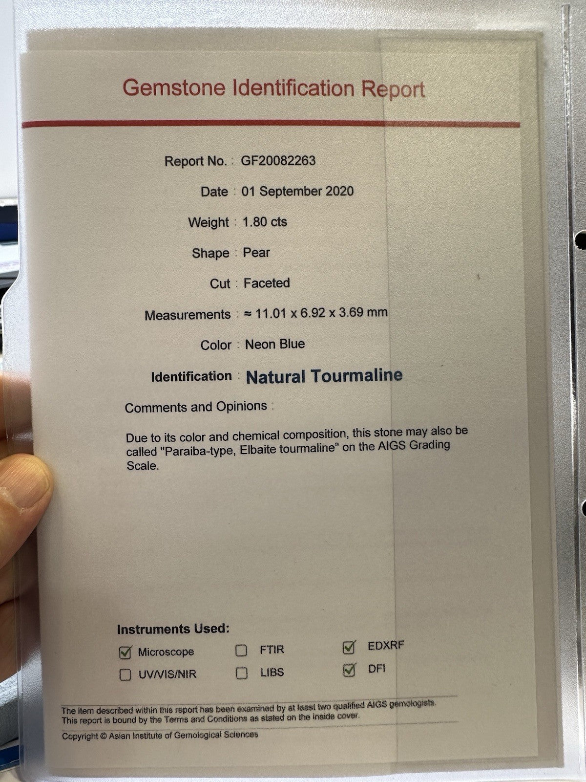 We are delighted to introduce a stunning 1.80ct ‘Paraiba’ Tourmaline gemstone, originating from Mozambique. This beautiful gemstone is known for its vibrant neon green blue color and is highly sought after in the jewelry industry for its rarity and unique beauty. The colour is simply spectacular! Clarity is wonderful, and the stone is not only eye clean but almost Louis clean as well. The cut is shallow, giving the gem a big face with some corresponding windowing. The included AIGS certificate confirms the authenticity and quality of this exceptional gemstone, making it a valuable addition to any jewelry collection. Shipping dhl