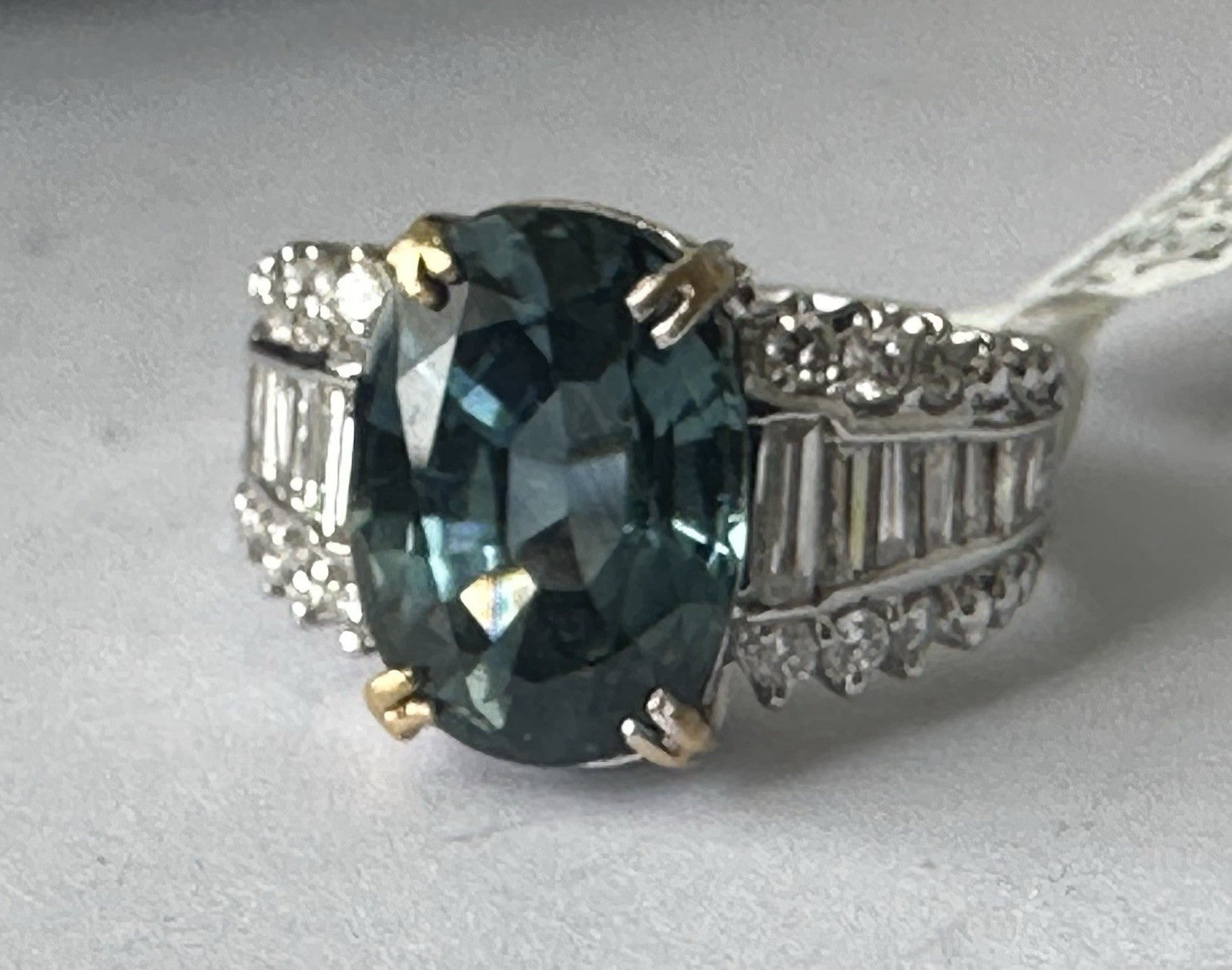 This product is a stunning 7.87ct unheated teal sapphire and diamond platinum ring, with certification from AIGS. The sapphire is of exceptional quality, with a deeply saturated green-blue color that is highly sought after. Clarity is good, the stone is almost but not quite eye clean. Originating from Madagascar, this gemstone showcases natural beauty without any enhancements, making it a rare and valuable addition to any jewelry collection. The diamonds total 1.15ct and are clean and white. The luxurious platinum setting and presence of sparkling diamonds further elevate this extraordinary piece of jewelry. Fully AIGS certified as colour Teal, no treatment. Rare and certain to increase in value as time goes by. Shipping FedEx DHL or ups