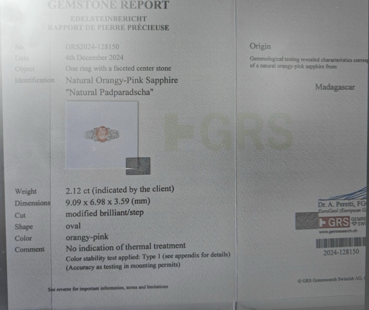 An Extraordinary Unheated 2.12ct Padparadscha Sapphire & Diamond Ring GRS