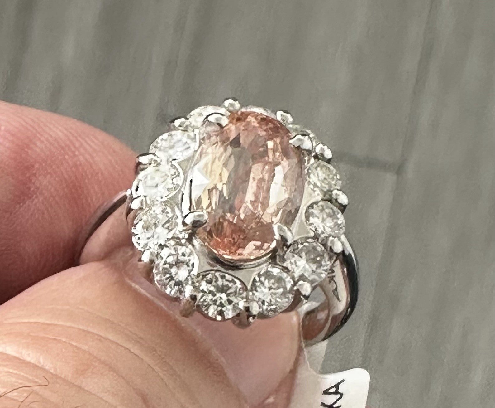 A simply stunning Estate ring set in solid Platinum and featuring a stunning Unheated Padparadscha Sapphire almost certainly from Sri Lanka weighing 3.91ct. The beautifully made Estate ring contains an array of clean and white diamonds of excellent quality totalling 1.66ct.