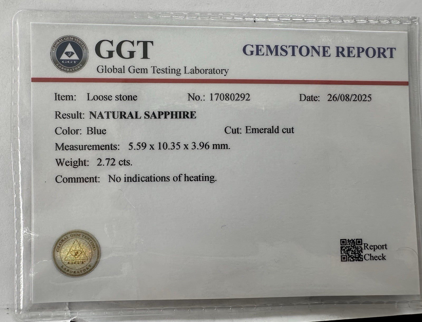 Exquisite 2.72ct Unheated No Heat Blue Sapphire & Certificate